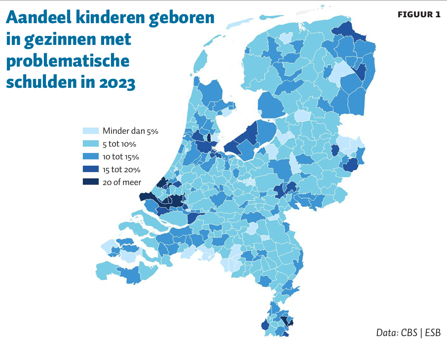In de meest recente versie van de monitor werd gevonden dat in de periode 2021–2023 drie procent van de kinderen geboren werd in een gezin met geregistreerde problematische schulden bij (een van) de ouders (Van Meijeren-van Lunteren et al., 2025). De monitor baseert zich voor dit onderdeel op twee gegevens, namelijk of er sprake is van een traject schuldhulpverlening (volgens de Wet schuldsanering natuurlijke personen; WSNP) en of er sprake is van een betalingsachterstand van minimaal zes maanden bij de zorgverzekering.